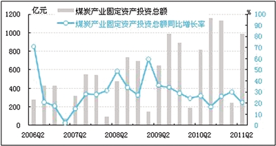经初步季节调整,2011年二季度,煤炭产业固定资产投资总额为986.1亿元,同比增长20.6%,同比增速比上季度回落9.4个百分点。