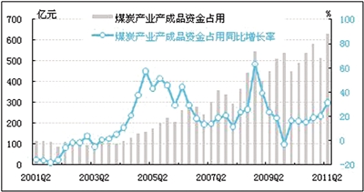 截至2011年二季度末,煤炭产业产成品资金占用为631.4亿元,同比增长31.3%,同比增速比上季度加快10.9个百分点;环比增长22.4%。