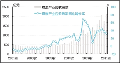 2011年二季度末,煤炭产业应收账款为2099.8亿元,同比增长31.8%,同比增速比上季度回落5.2个百分点。经计算,二季度煤炭产业应收账款周转天数由上季度的24.1天减少至本季度的22.8天,这表明煤炭企业的现金回流速度有所加快,资金流动性有所改善。