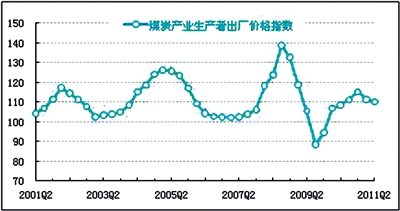 2011年二季度,煤炭产业生产者出厂价格同比增长10.2%,涨幅比上季度回落1.1个百分点,延续了上季度同比涨幅回落的趋势。煤炭产业生产者出厂价格变动明显受到国际国内两个市场的影响。一是国际市场上国际市场动力煤价格持续走高,国内煤价受其关联进入上行通道。二是国内方面,煤炭需求持续旺盛,支撑煤价上涨。