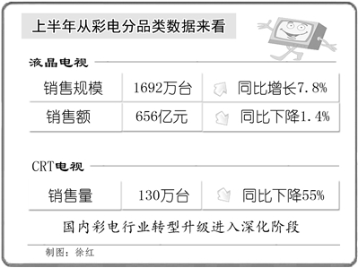 从彩电分品类数据来看,液晶电视上半年销售规模为1692万台,同比增长7.8%,销售额为656亿元,同比下降1.4%;CRT(彩色显像管)电视销量继续回落,上半年销售量仅有130万台,同比下降55%。