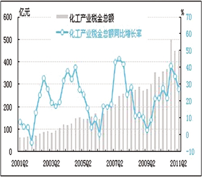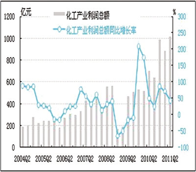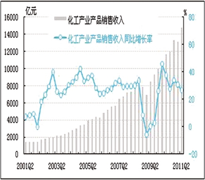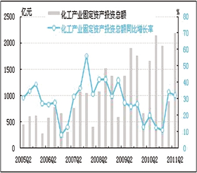 在调整产业结构、淘汰落后产能等政策作用下,化工产业固定资产投资总额同比增速持续回落,而随着“十一五”节能减排任务的完成,2011年一季度,企业的投资意愿明显增强,固定资产投资同比增速出现快速回升态势;工信部在今年3月份上调了“十二五”单位工业增加值能耗目标,对化工产业固定资产投资产生了抑制作用,使得二季度同比增速较一季度出现回落。但从整体趋势上来看,市场运行态势与调控政策的方向始终保持一致,调控效果显著。