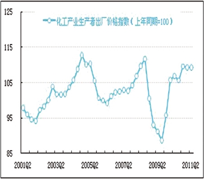 二季度,化工产业生产者出厂价格同比上涨9.3个百分点,涨幅与上季度持平。