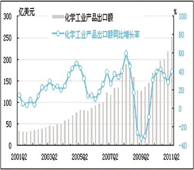 经初步季节调整,二季度化学工业产品出口额为251.3亿美元,同比增长40.5%,同比增速比上季度加快11.6个百分点;环比上升15%,环比增幅比上季度扩大4.9个百分点。