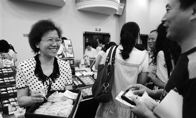 上图:近日,台中市一家食品企业的代表(左)在厦门市向大陆游客推介台湾小吃。台中市、桃园县、屏东县三县市负责人分别介绍了当地投资环境、产业发展、特色商品和旅游文化资源,并开展合作项目洽谈对接。