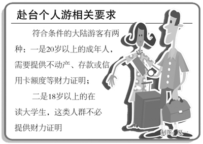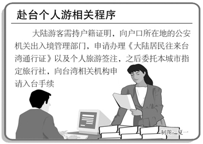 今年6月12日,邵琪伟宣布,大陆居民赴台个人游第一批试点城市为北京市、上海市和厦门市,并于6月28日前正式启动。目前,3座城市一共有33家旅行社取得业务资质。居民可以通过这些旅行社办理赴台手续。