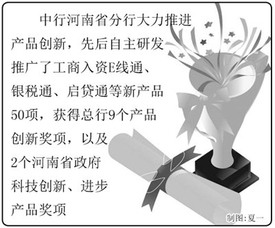 据中行河南省分行副行长张东向介绍,该行先后自主研发推广了“工商入资E线通”、“银税通”、“启贷通”等新产品共计50项,获得中行总行9个产品创新奖项以及2个河南省科技创新奖项,初步树立了具有中行河南省分行特色的“通”系列产品品牌形象。