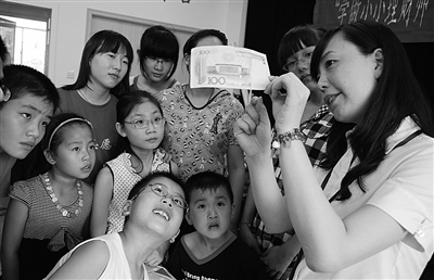 上图:江苏技术师范学院商学院的大学生志愿者和银行工作人员走进江苏省常州市钟楼区文亨花园社区,开展“学做小小理财师”夏令营活动。图为银行工作人员(右一)指导小朋友识别假币的方法与技巧。 石玉成摄(新华社发)