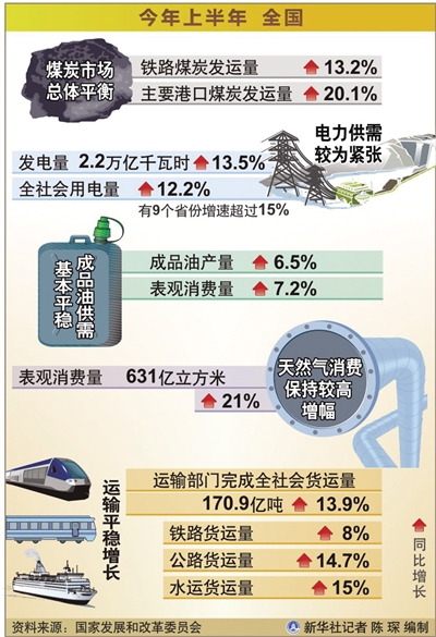 电力供需较为紧张。上半年,全国发电量2.2万亿千瓦时,同比增长13.5%;全社会用电量增长12.2%,有9个省份增速超过15%。受需求增长较快、来水偏少、火电亏损等多种因素影响,华东、华中、南方电力供需形势偏紧。6月中旬以后,这种状况有所缓解。