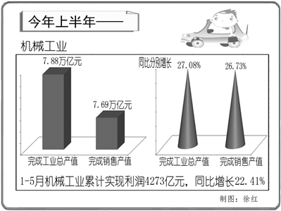 中国机械工业联合会日前发布的数据显示,今年上半年,我国机械工业总产值和销售产值同比分别增长27.08%和26.73%,工业增加值同比增长16.2%。总体来看,上半年机械工业经济运行实现平稳增长,利润总额保持增加,其中机械工业结构调整取得新进展成为最大亮点。