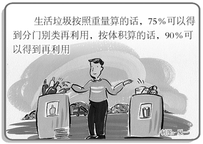 生活垃圾按照重量算的话,75%可以得到分门别类再利用;按体积算的话,90%可以得到再利用。
