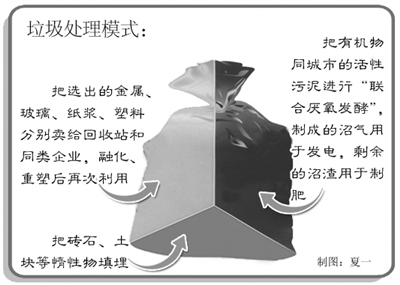 通过对比分析填埋、堆肥、焚烧、厌氧发酵等各种工艺的局限和长处,该公司逐渐清晰了技术路径,把各种方法进行了集成创新:回收利用塑料、金属等容易破坏环境的活性物质,填埋分选砖石、泥沙等不破坏环境的惰性物质;化解“喜氧发酵”带来的环境、成本压力,采取“厌氧发酵”的密闭工艺;避免处理垃圾有机物的单一发酵,采取同步处理粪便、污泥的有机废弃物“联合发酵”;把产生的沼气或者用于发电,或者经过提纯、净化用作汽车燃料。