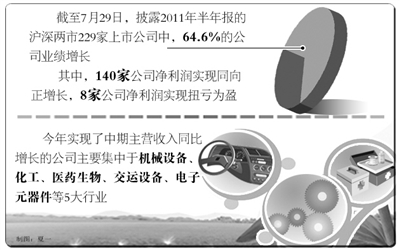 WIND咨讯统计数据显示,截至7月29日,沪深两市披露2011年半年报的上市公司达229家,其中,140家公司净利润实现同向正增长,8家公司净利润实现扭亏为盈,这些业绩增长公司占所有披露年报公司的64.6%。