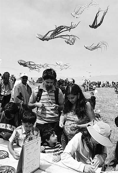为期两天的第26届伯克利风筝节于近日在美国加利福尼亚州伯克利开幕。图为风筝节上,人们学习制作风筝。 新华社发