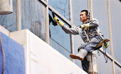8月3日,一位清洁工在清洗太原市一高楼的外墙玻璃。在高楼耸立的城市里,有一批专门从事高层建筑清洁的人,他们仅靠一根保险绳在高楼大厦上“行走”,这些清洁人员被称为“蜘蛛人”。炎炎夏日,“蜘蛛人”仍在烈日下坚守岗位,为扮靓城市挥洒着汗水和辛劳。