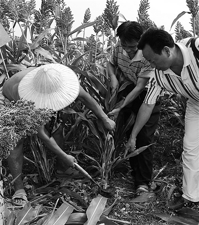 高粱地里,红红的高粱穗将一人多高的高粱秆压得直不起腰。宜宾市翠屏区农技站农技员刘灏蹲下来一面示范,一面为农户讲解收割技巧:“砍高粱秆时要注意,留的高度只能离地面两节,这样可以帮助高粱发芽,提高再生能力。”