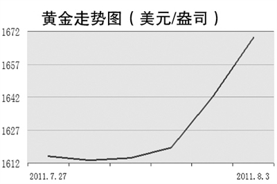 周一美国国会两党领袖宣布达成了提高政府债务上限并分两步削减联邦预算开支2.4万亿美元的协议,令市场对美债危机的担忧稍稍得到缓解,利多美元,对黄金市场造成压力。而且近期美国方面的经济数据更显疲弱,令市场避险情绪快速升温,因而美元、日元、瑞郎等避险资产反而受到资金青睐。当天,纽约商品交易所黄金期货市场交易最活跃的12月合约每盎司下跌9.5美元,收于1621.7美元/盎司,跌幅为0.6%;白银期货9月合约价格下跌79.7美分,收于39.31美元/盎司,跌幅为2%。
