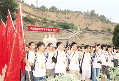 在参观完延安新闻纪念馆以后,青年编辑记者们在清凉山上的烈士雕像前庄严宣誓:“继承和发扬党的革命传统,高举旗帜,围绕大局,服务人民,改革创新,用中国特色社会主义理论体系武装头脑,用马克思主义新闻观指导新闻实践,弘扬职业精神,