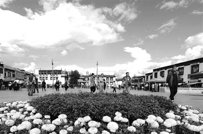 压题图片 拉萨市主城区的街景改造工程已经完成。花坛、标语、国旗把古老的拉萨装扮得格外靓丽。