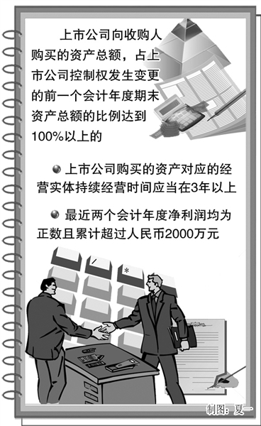 在规范、引导借壳上市方面,《办法》对借壳上市确定了较高标准。根据新办法,上市公司向收购人购买的资产总额,占上市公司控制权发生变更的前一个会计年度期末资产总额的比例达到100%以上的,上市公司购买的资产对应的经营实体持续经营时间应当在3年以上,最近两个会计年度净利润均为正数且累计超过人民币2000万元。这一要求已经与首次公开发行的标准接近。另外,金融、创业投资等特定行业的企业,暂不适用现行借壳上市的规定。