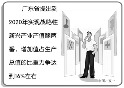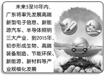 本报讯 记者庞彩霞报道:日前,广东省公布了《关于贯彻落实国务院部署加快培育和发展战略性新兴产业的意见》。《意见》提出,广东将以高端新型电子信息、新能源汽车、半导体照明三大产业为突破口,加快发展战略性新兴产业,到2020年实现战略性新兴产业产值翻两番,增加值占生产总值的比重力争达到16%左右。