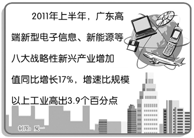 战略性新兴产业是广东实现转型升级的重要引擎,也是广东近期发展速度最快的产业领域之一。数据显示,今年上半年,广东高端新型电子信息、新能源等八大战略性新兴产业增加值同比增长17%,增速比规模以上工业高出3.9个百分点。“广东省委十届八次全会确定把‘加快转型升级、建设幸福广东’作为‘十二五’时期的核心任务。加快产业结构转型升级,培育发展具有国际竞争力和强大持久带动力的战略性主导产业,正是完成这个核心任务的关键。而培育战略性主导产业,突破口和重要抓手则是加快培育战略性新兴产业。”广东省省长黄华华道出了《意见》出台的重大意义。