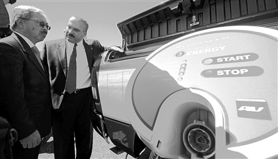 克莱斯勒汽车公司于近日在美国旧金山市启动一项14辆混合动力汽车节能环保性能实驾测试计划,由市政府14个部门实施,为期3年。图为克莱斯勒汽车公司代表(右)向旧金山市市长李孟贤(左)讲解克莱斯勒混合动力汽车的性能。 新华社发