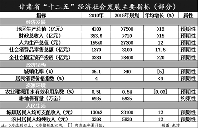 综合考虑各种因素,甘肃提出,未来5年要以推进科学发展为主题,以加快经济发展方式转变为主线,以显著提高各族人民生活水平和质量为目的,围绕建设工业强省、文化大省、生态文明省和各民族共同团结奋斗、共同繁荣发展的示范区,坚持“四抓三支撑”的总体工作思路,深入实施西部大开发战略和“中心带动、两翼齐飞、组团发展、整体推进”区域发展战略,进一步加强基础设施和生态环境建设,强化科技支撑,发展壮大特色优势产业,加快社会事业发展,提高公共服务水平,保障和改善民生,促进社会和谐,锐意改革创新,不断扩大开放,努力推动全省经济社会跨越式发展。到2015年,缩小人均地区生产总值与西部地区平均水平的差距,城乡居民收入接近西部地区平均水平。