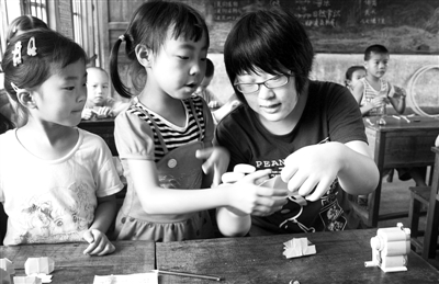 7月14日,在江西婺源参加支教的上海海事大学学生在教孩子们做手工纸活。暑假期间,上海海事大学计算机系大学生,自费来到地处皖、浙、赣三省交界的山区江西省婺源县江湾镇栗木坑小学支教,与孩子们同吃同住,过一个有意义的暑假。 本报记者 赖永峰 通讯员 王国红摄影报道