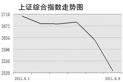 8月8日,沪指放量重挫近百点。受美国主权信用评级下调及亚太股市低开等影响,早盘沪深两市双双低开,沪指失守2600点大关,随后一路走低,盘中创下今年新低2497.92点,个股一度出现跌停潮。截至收盘,沪指报2526.82点,跌99.60点,跌3.79%,成交1176亿元;深成指报11312.63点,跌389.13点,跌幅3.33%,成交972亿元。盘面上,仅黄金板块坚挺。中金黄金涨幅超过6%,山东黄金和紫金矿业等也涨幅较大。