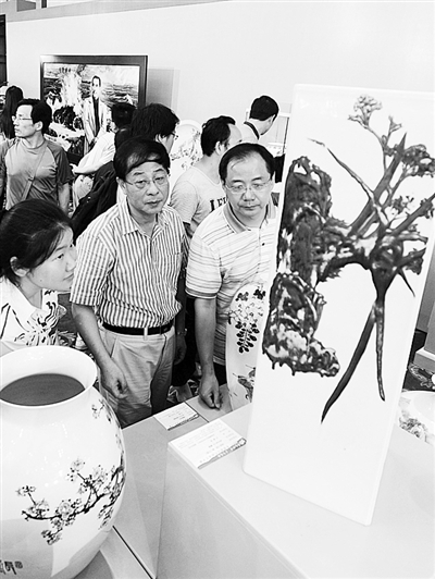 上图:7月31日,观众在参观展出的陶瓷作品。当日,景德镇大型红色主题陶瓷艺术展在南昌开始全国巡展。据了解,该展览还将在北京国家博物馆、上海展览中心和广州岭南艺术馆等进行巡回展览。 新华社记者 周 科摄