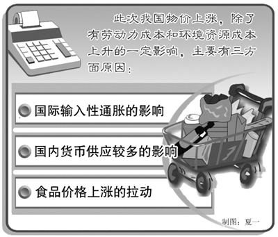 物价问题看似复杂,但也有其简单的一面。分析此次我国物价上涨的原因,除了劳动力成本和环境资源成本上升的一定影响,还主要有三方面原因,一是国际输入性通胀的影响,二是国内货币供应较多的影响,三是食品价格上涨的拉动。