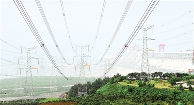 8月9日拍摄的三峡左岸电站外送输电线路。据国家电网华中公司相关人员介绍,按长江防总下泄流量的要求,三峡电厂29台机组全部投产以来,近日首次实现全开满发,总出力2005万千瓦。据介绍,立秋前后,长江上游地区的大范围强降雨使三峡电厂入库流量迅速增加。