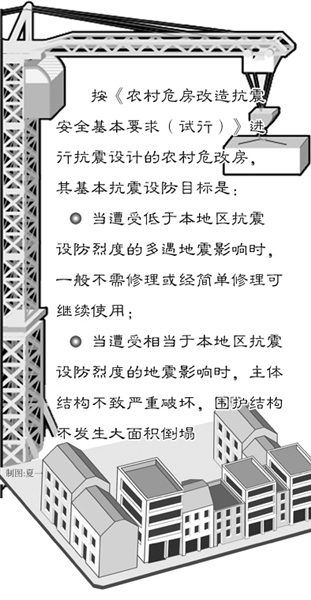 按《农村危房改造抗震安全基本要求(试行)》进行抗震设计的农村危改房,其基本抗震设防目标是:当遭受低于本地区抗震设防烈度的多遇地震影响时,一般不需修理或经简单修理可继续使用;当遭受相当于本地区抗震设防烈度的地震影响时,主体结构不致严重破坏,围护结构不发生大面积倒塌。