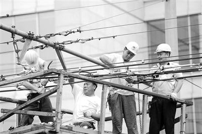 8月9日,北京宣武门附近公交车站,工程人员正在抢修故障线路。连日来,京城持续高温闷热天气,许多在烈日下工作的劳动者默默奉献,坚守岗位,赢得了全社会的尊敬。 本报记者 赵 晶摄