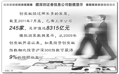 据深圳证券信息公司数据显示,创业板经过两年多的发展,截至2011年7月底已有上市公司245家,总市值达8315亿元。上市公司整体表现出较高的盈利指标和成长指标。不过从短期来看,创业板整体估值尚处在“去泡沫化”过程中,部分上市公司业绩出现分化,但仍不乏众多高成长性的优质上市公司,且当前创业板平均个股规模较小,部分公司上市后进入“二次创业”阶段,未来成长空间较大。数据显示,过去几年中小企业板和主板不乏出现高速成长、市盈率数十倍、市值扩张数十倍的优质上市公司,相信未来创业板市场也有望出现类似“以高成长消化高估值”的优质上市公司。