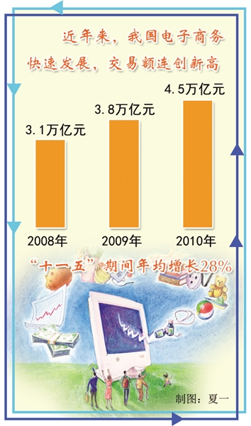 近年来,我国电子商务快速发展,交易额连创新高,2008年达到3.1万亿元,2009年达到3.8万亿元,2010年达到4.5万亿元,“十一五”期间年均增长28%。电子商务在各领域的应用不断拓展和深化,相关服务业蓬勃发展,支撑体系不断健全完善,创新的动力和能力不断增强。徐愈表示,“电子商务正在与实体经济深度融合,成为推动国民经济增长的新动力。”