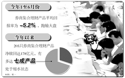 股市的持续调整,让券商资产管理部门的日子不好过。1至6月份,券商集合理财产品平均回报率为-5.2%,跑输大盘。出于对后市的担忧,许多产品持有人选择了赎回。Wind最新数据显示,今年以来,205只集合理财产品净赎回达到178亿元,有多达七成产品处于缩水状态。