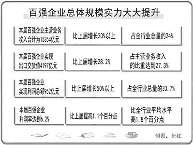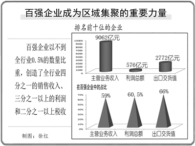 百强企业日益成为推动产业集中和区域集聚的重要力量。百强企业以不到全行业0.5%的数量比重,创造了全行业四分之一的销售收入、三分之一以上的利润和二分之一以上的税收。本届百强企业,长三角、珠三角及环渤海三大经济区占80%以上,其中广东、江苏、北京、浙江等省市百强企业均超过10家,辐射和带动了中小企业向周边聚集。