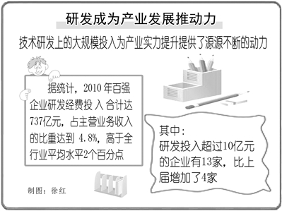 技术研发上的大规模投入为产业实力提升提供了源源不断的动力。据统计,2010年百强企业研发经费投入合计达737亿元,占主营业务收入的比重达到4.8%,高于全行业平均水平2个百分点。其中,研发投入超过10亿元的企业有13家,比上届增加了4家;研发投入最高的华为达到203亿元,占其主营业务收入的比重超过10%。