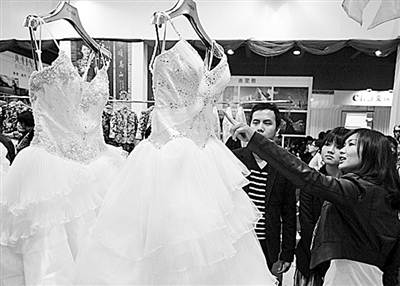 同样在婚纱和礼服上精打细算的,还有来自上海的刘琳琳。“我在婚宴上穿的拖地婚纱是向我表姐借的。那件婚纱她是花800元买的,只穿了一次,干洗以后跟新的没什么两样。礼服是去年9月去苏州买的,当时天气还比较热,购物时间又选的是工作日,顾客非常少,老板直接就给了我们最低价。”刘琳琳给记者算笔账,“3套礼服一共才花了680元。价格便宜,做工也还不错,在上海商场买件衣服都不止这个价。”