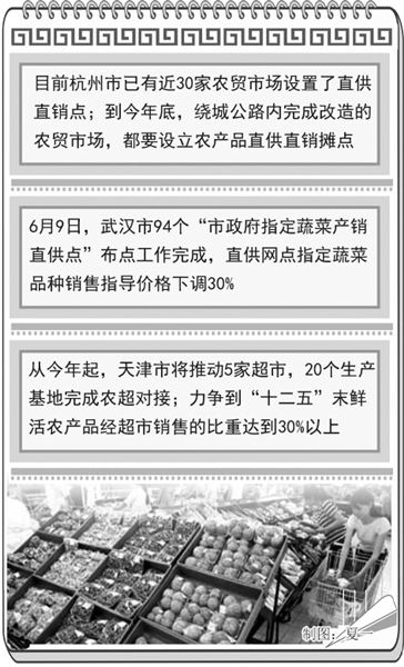 从今年起,天津市将通过国家和地方共同推动,突出扶强、扶优、扶大的原则,推动大型连锁超市建立农产品直采基地和区域配送中心、完善冷链系统建设,力争到“十二五”末鲜活农产品经超市销售的比重达到30%以上。今年,天津将推动5家超市和20个生产基地完成农超对接;推动农产品经营龙头企业在市区和各区县政府所在地建设农产品经营连锁店(柜)和物流配送中心,发展一批农超对接生鲜超市,将大部分设施农业产品纳入“农超对接”销售范围。