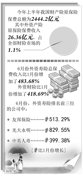 不过,从今年1月到6月的数据看,外资保险公司的保费收入呈逐月增加趋势,6月份外资寿险总保费收入比1月份增加了483.68%,外资财险比1月份增加了418.69%。外资寿险排名前三位的公司中,友邦保险6月的保费收入比1月增长了513.29%,光大永明增长829.55%,中英人寿增长399.38%。显然,发展趋势向好。