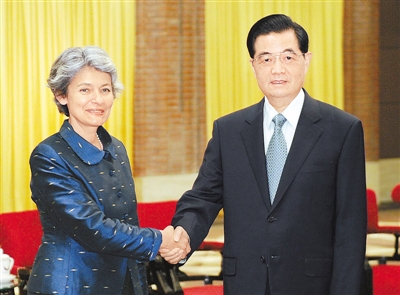 新华社深圳8月11日电 (记者刘东凯 孔博) 国家主席胡锦涛11日在广东省深圳市会见了来华访问并出席第26届世界大学生运动会开幕式的联合国教科文组织总干事博科娃。
