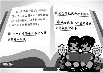 这位负责人表示,为如期实现4%目标,在增加公共财政预算教育投入的同时,还要积极拓宽财政性教育经费来源渠道。(一)统一内外资企业和个人教育费附加制度。(二)全面开征地方教育附加。2010年11月,财政部印发了《关于统一地方教育附加政策有关问题的通知》,要求各地统一地方教育附加政策,未开征地方教育附加的省份,要尽快对本行政区域内缴纳“三税”的单位和个人(包括外商投资企业、外国企业及外籍个人),按照实际缴纳税额的2%征收地方教育附加;已开征但征收标准未达到“三税”税额2%的省份,要尽快将征收标准统一到2%。目前,绝大多数省份已将开征方案或调整征收标准的方案报财政部审批。全面开征地方教育附加,进一步拓宽了财政性教育经费来源渠道,有利于多渠道增加教育投入。(三)从土地出让收益中按比例计提教育资金。为进一步增加教育投入,经国务院同意,从2011年1月1日起,各地要进一步调整土地出让收益的使用方向,从以招标、拍卖、挂牌或者协议方式出让国有土地使用权取得的土地出让收入中,按照扣除征地和拆迁补偿、土地开发等支出后余额10%的比例,计提教育资金。