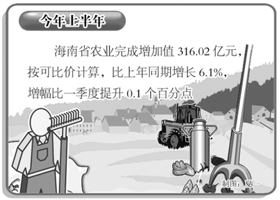 本报讯 记者陈发卿报道:今年上半年,面对长时间低温阴雨寡照天气的影响和香蕉、瓜菜等部分大宗农产品价格下跌的冲击,海南各地采取一系列有效措施加以积极应对,全省农业经济总体在较快轨道上保持稳步发展。初步测算,上半年,全省农业完成增加值316.02亿元,按可比价计算,比上年同期增长6.1%,增幅比一季度提升0.1个百分点,增速高出全国平均水平2.9个百分点;全省农民人均收入也有明显提高,实现农业增产农民增收。