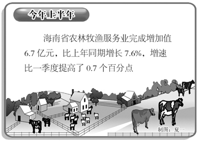 随着近年来农业服务需求的提高,海南省制种、技术服务、农产品包装等一批与农业生产关联的服务不断发展,农业产业化程度不断提升。上半年全省农林牧渔服务业完成增加值6.7亿元,比上年同期增长7.6%,增速比一季度提高了0.7个百分点。