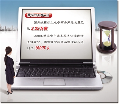 中小企业动动鼠标就能拿到海外订单,消费者在家中就可等快递送来心仪的商品……这些交易行为都是通过形形色色的电子商务平台来实现的。作为现代服务业的重要组成部分,我国电子商务平台数量稳步上升,截至2011年6月,国内规模以上电子商务网站总量已达2.32万家。2010年,通过电子商务服务企业进行直接就业、弹性就业和灵活就业的人员超过160万人。