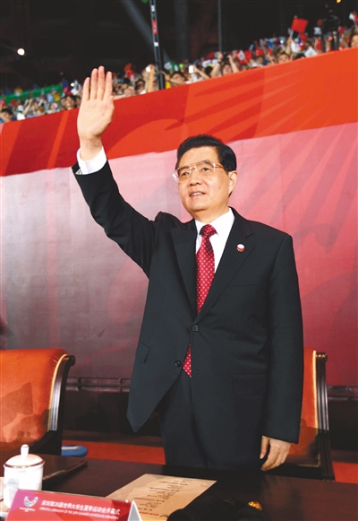 21时55分,国家主席胡锦涛用洪亮的声音宣布:深圳第二十六届世界大学生夏季运动会开幕!