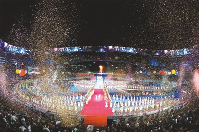 图2 8月12日晚,深圳第二十六届世界大学生夏季运动会在广东省深圳市隆重开幕。这是大运会主火炬点燃后深圳湾体育中心内一片欢腾。